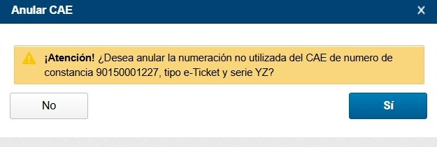 Al hacer clic en el botón “Anular CAE”, se solicitará la confirmación para la anulación de la numeración del CAE.