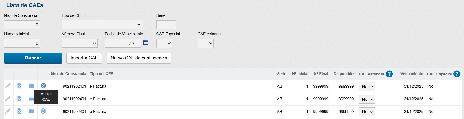Al acceder a la Lista de CAEs, se mostrará una nueva opción llamada “Anular CAE”, disponible junto a las demás funciones de cada CAE registrado.