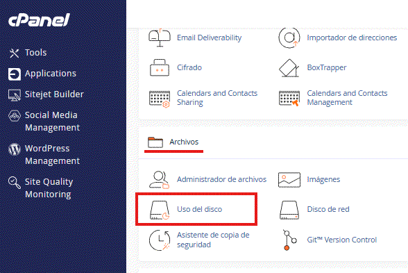 También como administradores se cuenta con una entrada que nos ayuda a analizar el espacio utilizado actualmente en cPanel. La misma se encuentra dentro de la opción Archivos y se llama Uso del disco