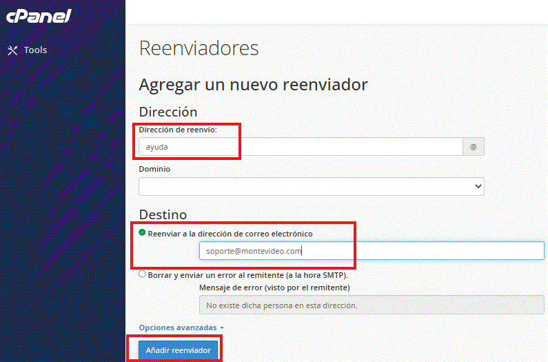 En el ejemplo de la imagen, podremos ver como todos aquellos mensajes que desde cualquier remitente, se envíen a ayuda@mvdfactura.com.uy – serán reenviados en forma automática por el hosting a ayuda@mvdfactura.uy